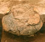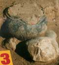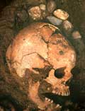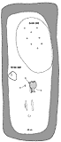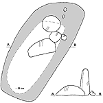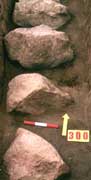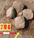 W grobach szkieletowych spotykamy różnego rodzaju elementy kamienne. Wśród nich możemy wyróżnić 3 grupy, w zależności od miejsca, w których zalegały: Grupę I stanowią groby (25 pochówków), w których kamienie umieszczono w stropie jamy. Najczęściej były to duże, pojedyncze kamienie znajdujące się w różnych częściach jamy (w N - gr. 99; w S - gr. 198; w centralnej części - gr. 433). Wystąpiły także grupy 2-5 średnich i dużych kamieni nie tworzących zwartych układów (np. gr. 273, 280). W stropie 6 grobów szkieletowych znajdowały się bruki, ułożone na jamie grobowej, składające się w większości z niewielkich kamieni (np. gr. 116).W Kowalewku odnotowano także szczególne konstrukcje kamienne. Zaliczyć do nich można układ 4 dużych kamieni ułożonych w kwadrat z 5 w środku. Możemy tutaj wyróżnić 2 warianty: z dużym (gr. 117) i małym kamieniem pośrodku (gr. 122 - ryc. 30). Niekiedy przy tego typu układach wystąpił bruk kamienny (gr. 120 - ryc. 31). Prawdopodobnie do opisanych powyżej, zaliczyć należy także układ z grobu 429, gdzie centralne miejsce zajmowała "stela" w kształcie ostrosłupa, z przylegającymi do niej innymi kamieniami stanowiącymi wzmocnienie (ryc. 32). W tym miejscu chcielibyśmy wspomnieć o jeszcze jednym obiekcie. O ile z analizy naziemnych elementów kamiennych mogliśmy wykluczyć pochówki wyrabowane, o tyle w przypadku grobu 339 jest trudne ustalenie tego faktu, ze względu na brak materiału kostnego. Ponadto forma obiektu wydaje się być specyficzna na omawianym cmentarzysku. Jama grobowa posiadała kształt owalny o wymiarach 260 x 250 cm, w profilu zbliżony do trapezowatej o miąższości do 140 cm. W stropie, na obrzeżu, od strony zachodniej znajdowały się 3 niewielkie kamienie, stanowiące prawdopodobnie pozostałość po wieńcu okalającym jamę. W centralnej części zalegały kamienie skupione wokół dużego głazu. Na zakończenie należy dodać, iż wszystkie opisane powyżej elementy kamienne miały na celu oznaczenie już istniejącego pochówku. Do grupy II zaliczyliśmy 3 pochówki, gdzie kamienie wystąpiły bezpośrednio pod stropem jamy grobowej. W trzech grobach 451, 479, 341 (ryc. 33) były to pojedyncze, niewielkie kamienie, które być może znalazły się tam przypadkowo. Inaczej przedstawia się sytuacja w grobie 201, gdzie pod stropem jamy, bezpośrednio nad szkieletem, znajdowały się 4 duże kamienie (ryc. 34). Ułożone były one wzdłuż osi jamy grobowej, ostatni z nich, umieszczony w północnej części, posiadał kształt zbliżony do ostrosłupa o wysokości ok. 90 cm i szerokości u podstawy ok. 60 cm. Powierzchnia kamienia wskazuje na to, iż prawdopodobnie tylko jedna strona poddana była niewielkiej, dodatkowej obróbce. Jak się wydaje, omówiony kamień możemy uznać za "stelę". Ostatnią III grupę reprezentują groby z kamieniami znajdującymi się na spągu jamy, bezpośrednio przy szkielecie (45 grobów). Pochówki te możemy podzielić na dwa typy. Pierwszy z nich, gdzie złożono zazwyczaj niewielkie, występujące pojedynczo lub w grupach kamienie, i tylko w nielicznych przypadkach tworzące jakiś układ. Najczęściej umieszczano je bezpośrednio przy głowie lub w niewielkiej odległości od niej (14 grobów - wśród nich możemy wyróżnić grób 219, gdzie za głową ułożone były półkoliście drobne kamienie) (ryc. 35). Poza tym wystąpiły one przy rękach (5 grobów), na klatce piersiowej (1 grób), przy miednicy (2 groby), nogach (8 grobów) i w pobliżu stóp (10 grobów), rzadko w tym samym grobie w różnych miejscach (7 grobów). Do typu drugiego zaliczyliśmy układ dużych kamieni odkryty w 5 grobach. Sposób ich ułożenia sugeruje, iż możemy mieć tutaj do czynienia z ideą składania zwłok w komorach kamiennych. |