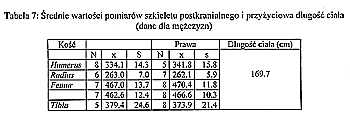Kolejnym etapem analizy (tab. 5) była ocena kształtowania się średnich wartości cech czaszki (tab. 6) i szkieletu postkranialnego (tab. 7 - 8) badanych osobników. |