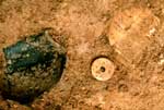 z resztek wrzeciona z brązowym okuciem i szklanym paciorkiem. W pozostałych dwóch