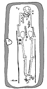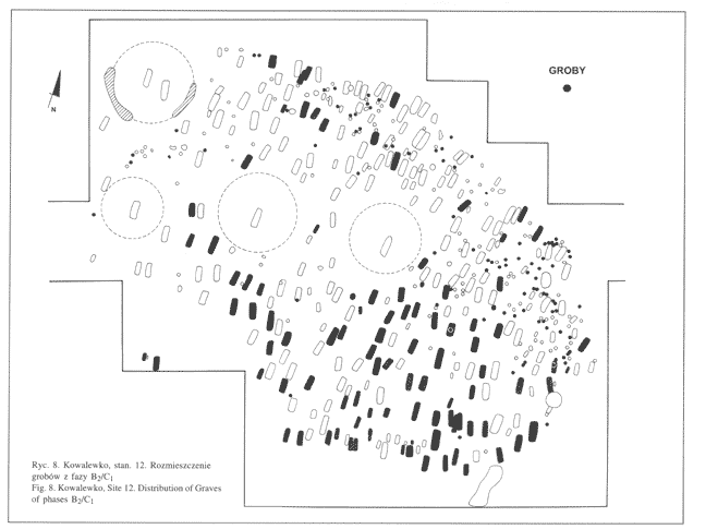 B2/C1. Na cmentarzysku w Kowalewku odkryto 277 płaskich i 5 podkurhanowych grobów szkieletowych. Jamy grobowe wszystkich pochówków zorientowane były na osi N-S bądź zbliżone. Długość, szerokość i głębokość jam uzależniona była od wieku pochowanej osoby (krótsze, płytsze - dzieci; dłuższe, głębsze - dorośli), tylko w niektórych przypadkach zdecydowanie przewyższała długość pochowanych w nich osób (np. jama, gr. 201 posiadała dł. 340 cm). Większość pochowanych w grobach osób leżała w pozycji na wznak, z rękoma wzdłuż ciała, z głową w kierunku N (ryc. 28, ryc. 29). |