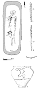 Obrządek pogrzebowy Groby ciałopalne / Groby szkieletowe / Drewno / Rozmieszczenie grobów z "nietypowym" umieszczeniem szkieletu Na cmentarzysku w Kowalewku odkryto 491 grobów płaskich i 5 podkurhanowych. Uwagę zwraca rozmaitość sposobów składania zwłok, ich wyposażania, odmienności konstrukcji grobów, a także przemiany zachodzące w obrządku pogrzebowym, w trakcie użytkowania cmentarzyska. |